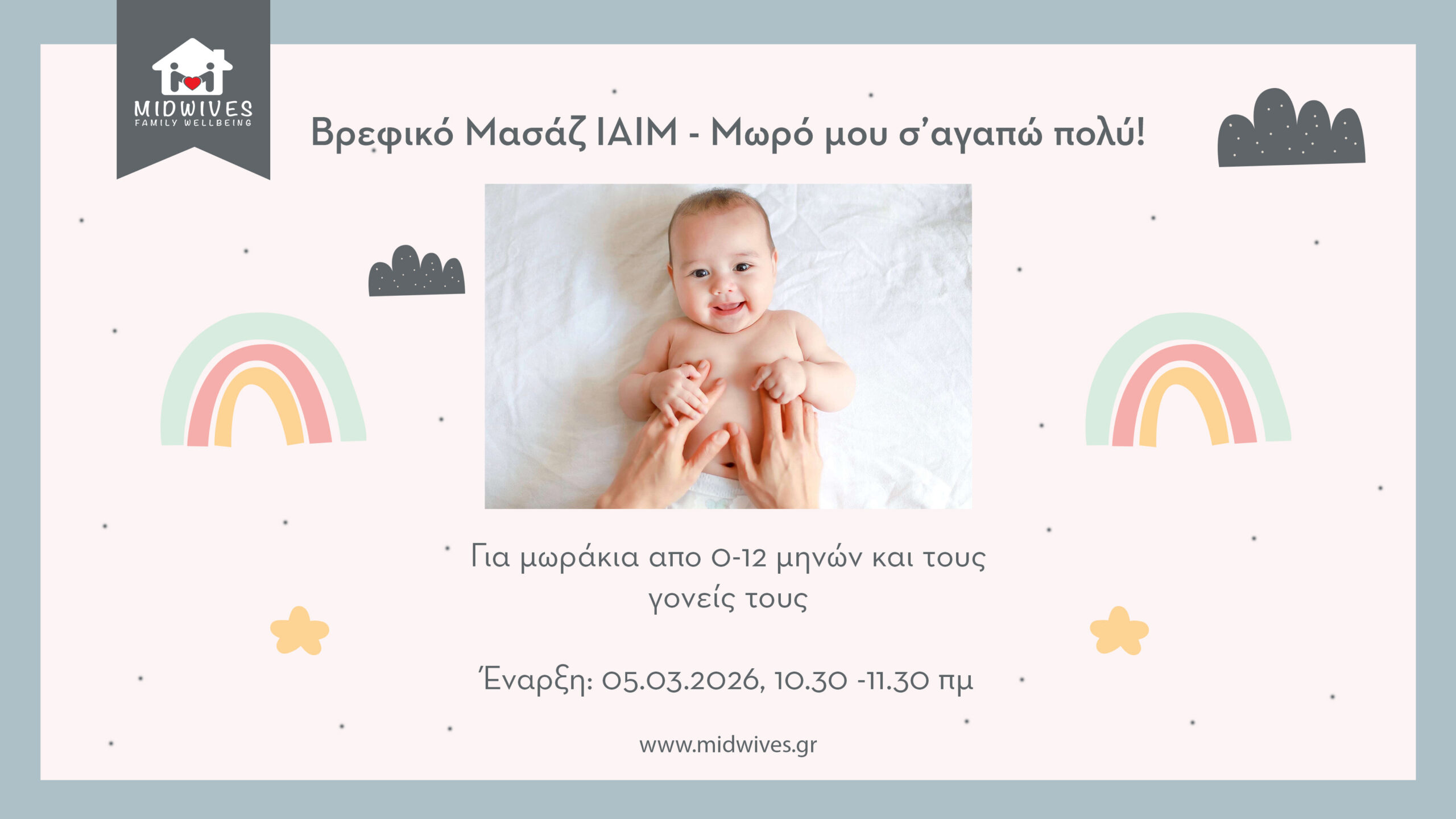 Στο Μidwives, την Πέμπτη 05 Μαρτίου 2026, στις 10.30 πμ, ξεκινά νέος πρωινός κύκλος, πέντε δια ζώσης συνεδριών “Βρεφικού Μασάζ ΙΑΙΜ – Σ’αγαπώ πολύ”!