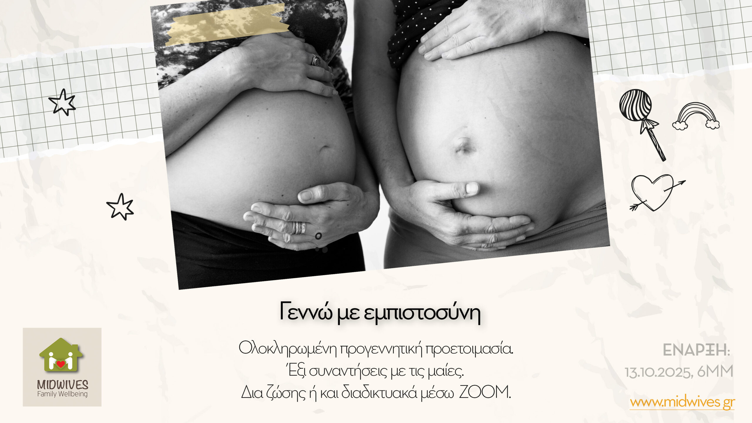 Στο Midwives, τη Δευτέρα 13 Οκτωβρίου 2025, στις 6.00 μμ ξεκινά νέος κύκλος, έξι προγεννητικών συναντήσεων – “Γεννώ με εμπιστοσύνη”, για εγκύους και τους συντρόφους τους. Οι γονείς μπορούν να συμμετέχουν δια ζώσης ή μέσω διαδικτύου (ΖΟΟΜ).